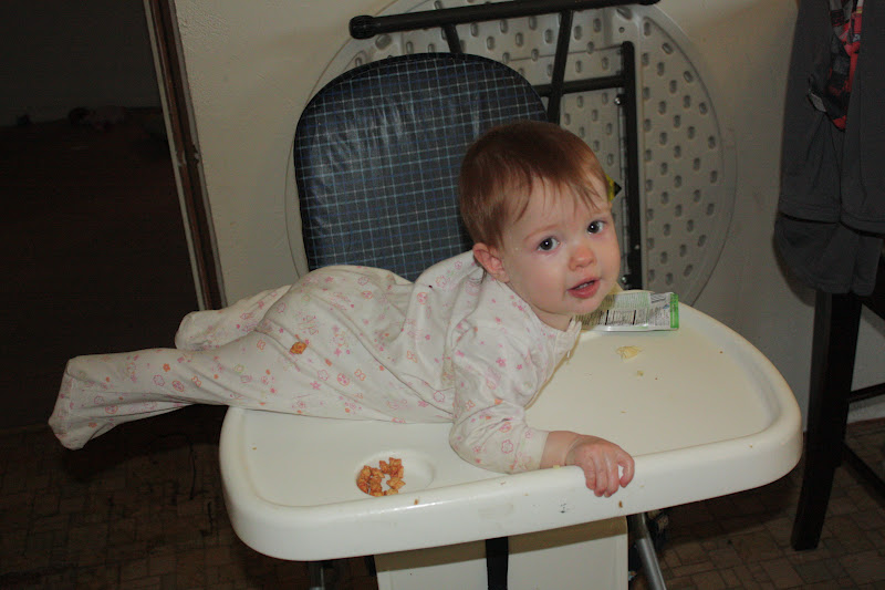 some things about Brea. First, her top four front teeth are all coming in, but the two on either side of the front ones started coming in first...fang baby! :) She also has been dancing. Anything with a fast-paced beat and she is wiggling and a-movin'! She has also started this fake distressed look and breathy grunty fuss when she wants something or doesn't want something. Its very funny and absolutely pre-meditated. Little miss smarty pants! I'm still nursing her in the morning and at night, but I'm honestly wondering how much longer that will last. She doesn't seem to need it for comfort purposes like Ailey did. She reminds me more of the boys in this. They were always way more interested in what was going on around them, than in continuing feeding. Plus, they wanted to control the food themselves. Interesting that Brea is following suite there. When she gets sleepy, she finds her blanket, sticks her fingers in her mouth and will snuggle her head down into the blanket. All I have to do is go put her in her bed and she goes to sleep. Love that! Also a little note, when she even sees her blanket and isn't tired, she automatically puts her fingers into her mouth. The two go hand in hand with her. :) Okay, just wanted to get that on here before I forgot...again. ;p